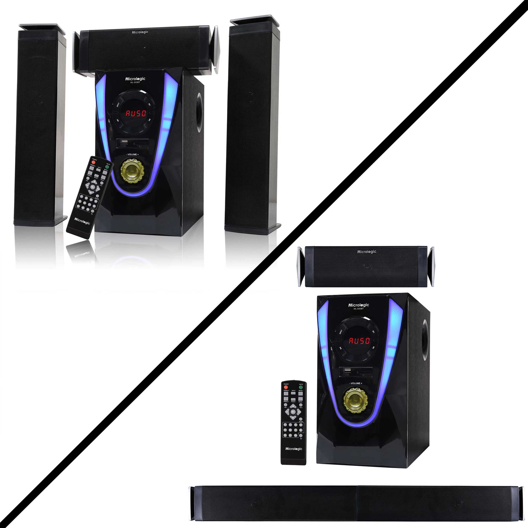 Features: Micrologic ML-533 BT 3.1 Multimedia Bluetooth Speaker with 3 high resolution satellite speakers which is built with 1 powerful speakers for loud and 1 tutor speakers extended sound quality and 1 powerful woofer for authentic and precise sound. It gives you the performance to experience more realistic and more immersive sound.